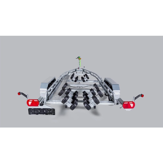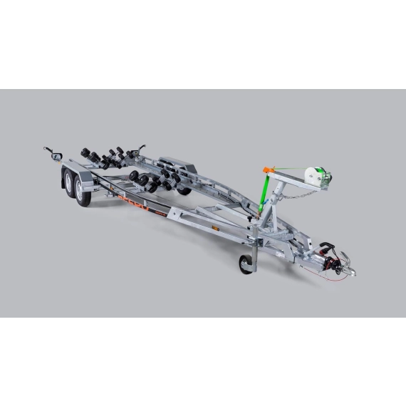 Innovativ Multiroller-henger med selvregulerende ruller som sikrer jevn og trygg gang på hengeren under båtopptak og utsetting.