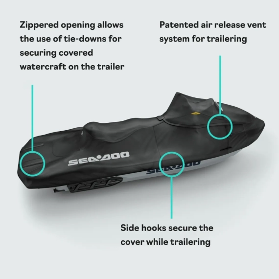 Når kjøreturen er over, er det viktig å ta godt vare på vannscooteren. Både under transport på henger og ved lagring er den utsatt for slitasje, smuss og solbleking. Med et originalt Sea-Doo-trekk reduserer du risikoen for skader betydelig.