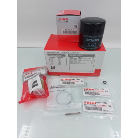 Dette er et originalt Yamaha 100-timers servicekit, sammensatt for Yamahas anbefalte førsteservice etter innkjøring. Kitet inneholder nødvendige slitedeler som normalt byttes ved 100-timers service, og gir en enkel og trygg gjennomføring av korrekt vedlikehold på motoren.